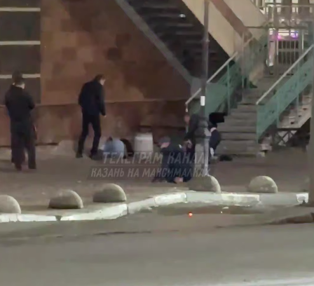На видео видно, что двое мужчин бьют молодых людей, которые уже лежат на земле.